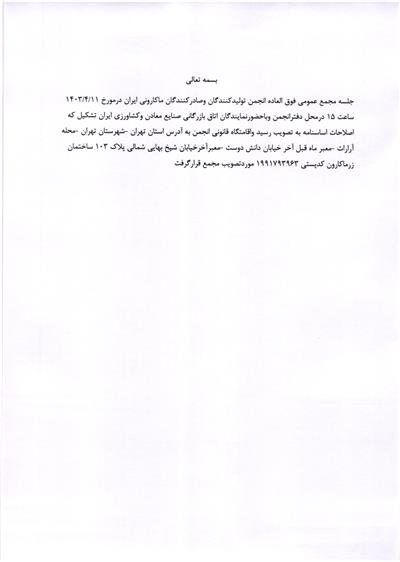 دعوتنامه مجمع عمومی فوق العاده و مجمع عمومی عادی بطور فوق العاده انجمن تولیدکنندگان و صادرکنندگان ماکارونی ایران