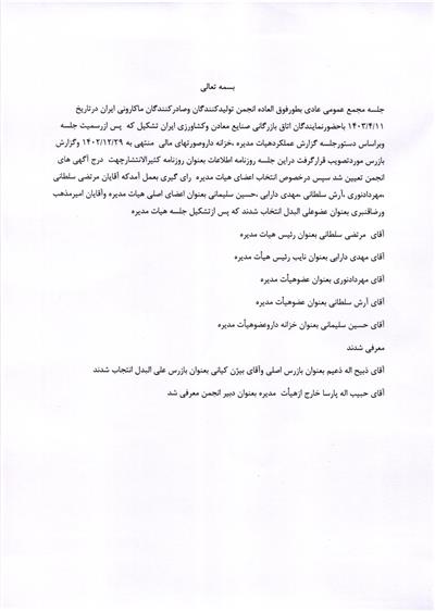 گزارش جلسه مجمع عمومی عادی بهطور فوقالعاده انجمن تولیدکنندگان وصادرکنندگان ماکارونی درمورخ 1403/04/11